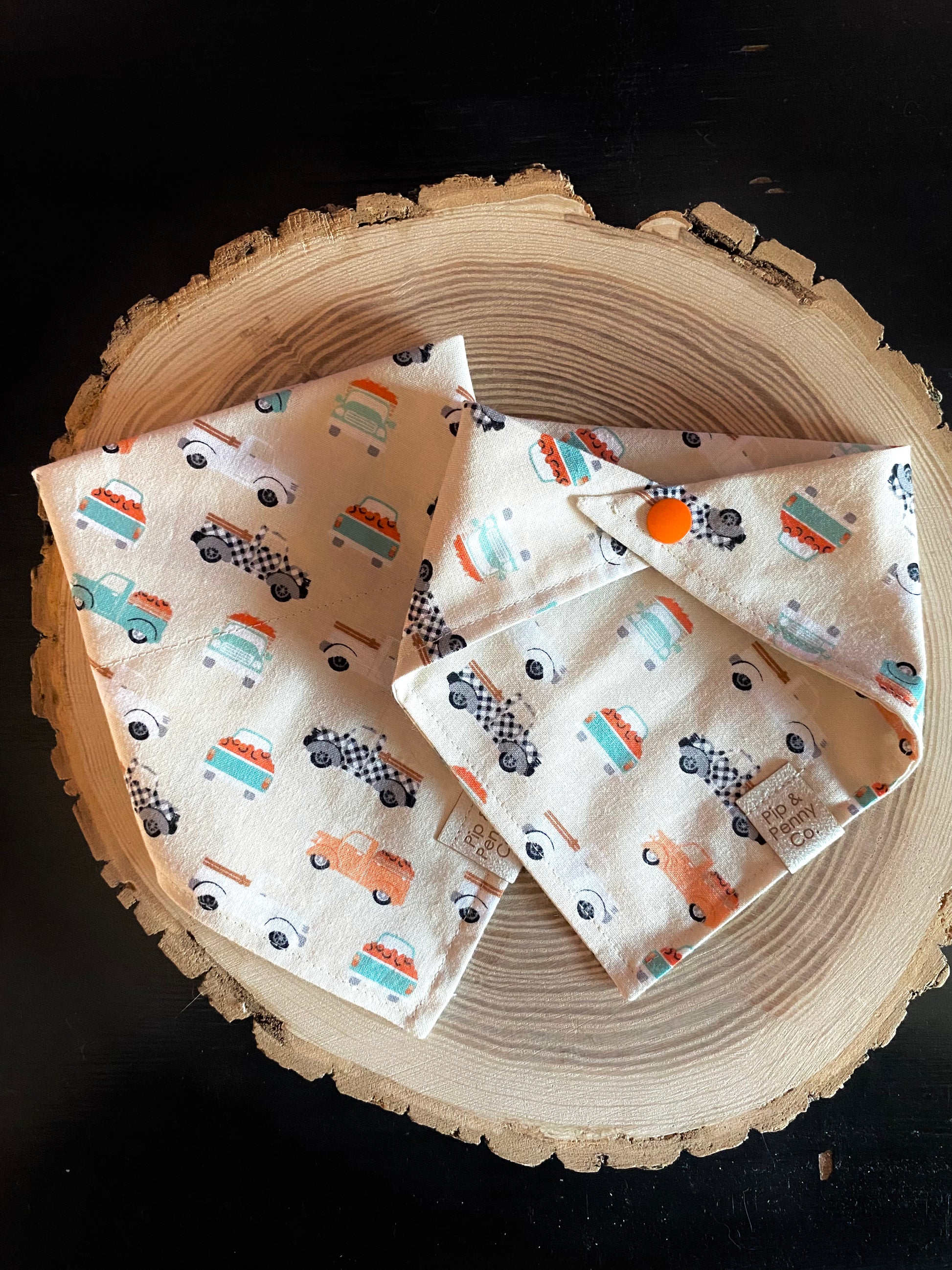 Snap Bandanas: Measure your pet's neck not their collar. If you're in between sizes, size up, the bandana can always be tied to fit smaller. Each bandana has 2 snaps one inch apart (except the Extra Small).