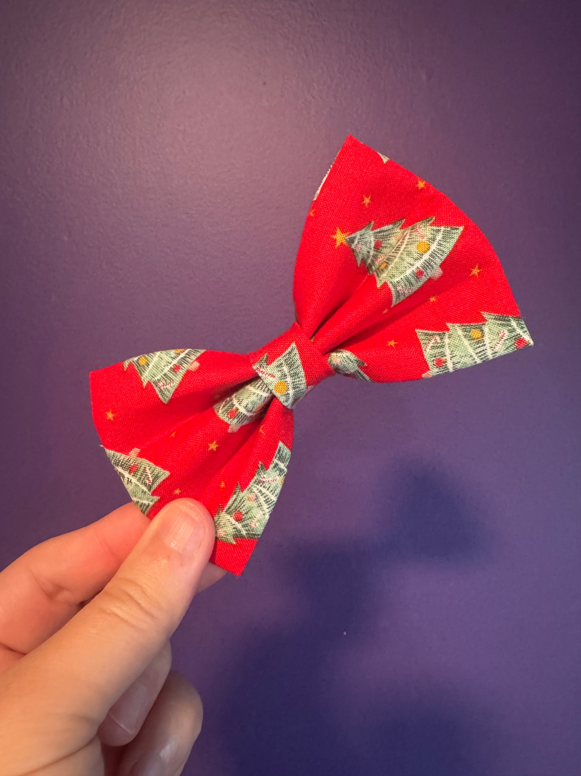 Our Collar Bow ties slide onto your pet's existing collar with two elastics on the back of the bow.