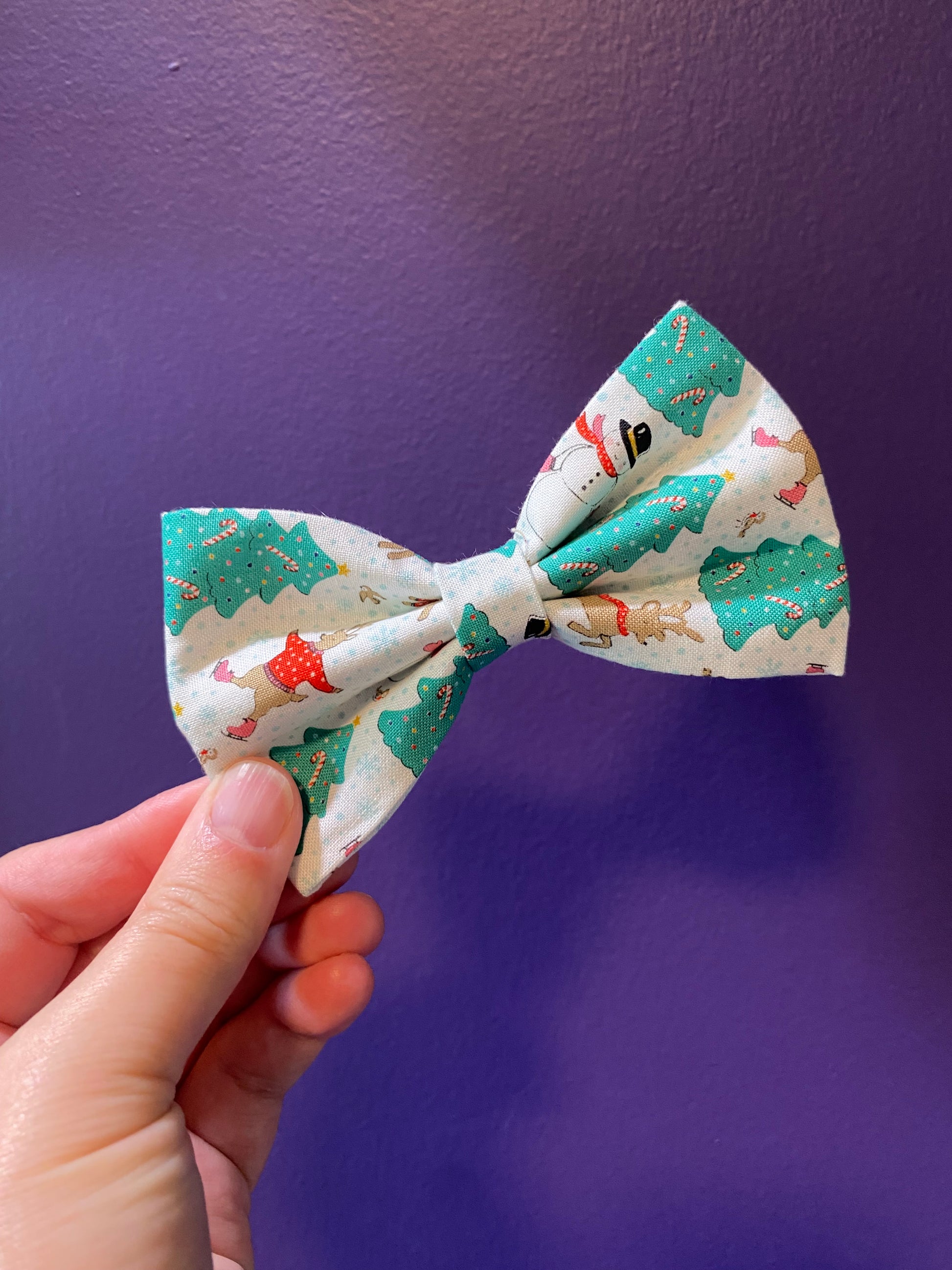 Our Collar Bow ties slide onto your pet's existing collar with two elastics on the back of the bow.