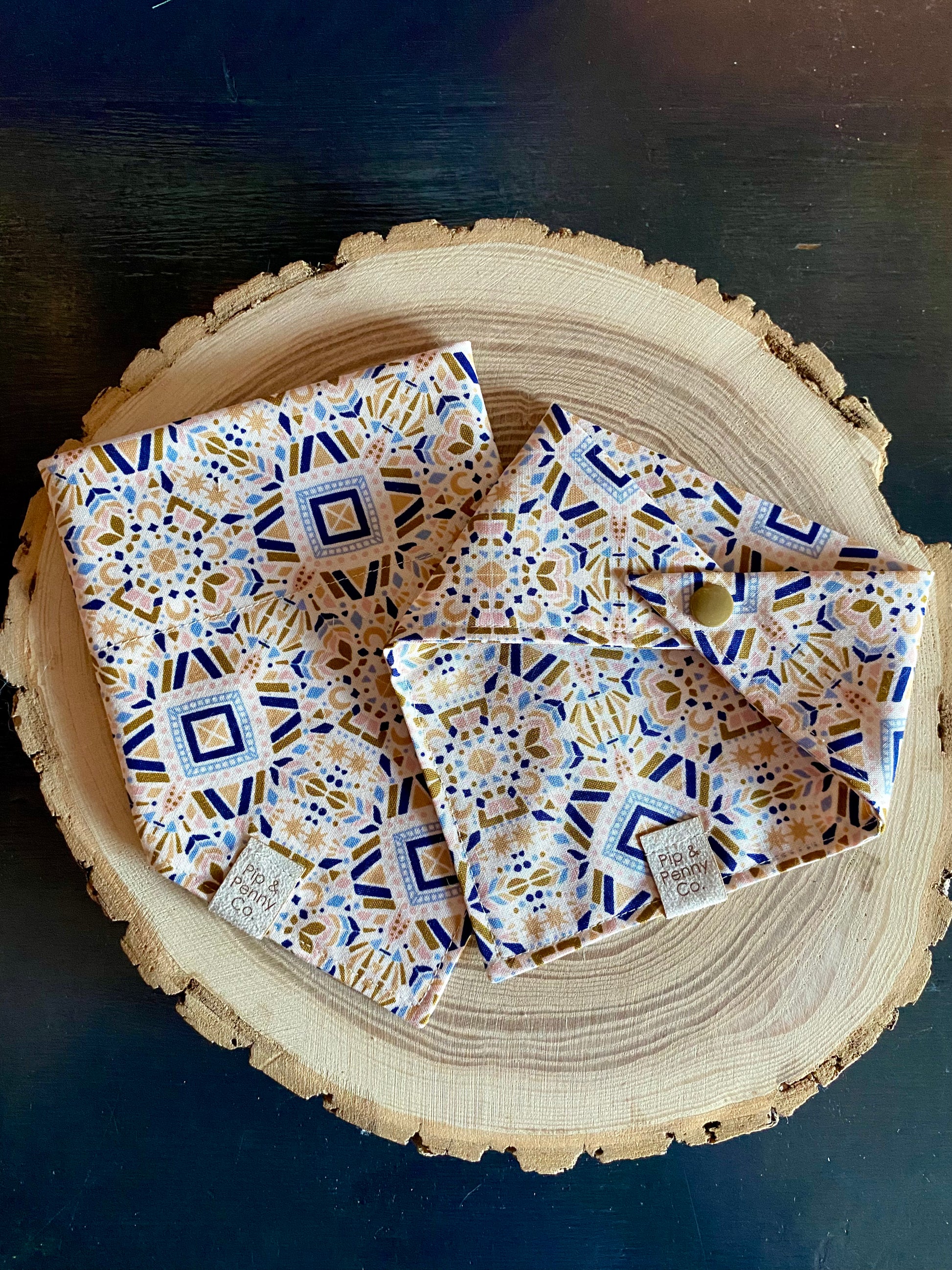 Each bandana and bow are hand made with care and for this reason the orientation of the fabric may be different on each item depending on the pattern of the fabric.